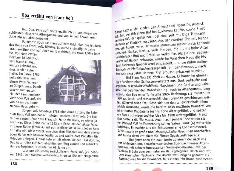 Die Bestseller-Autorin Gabriella Engelmann hat durch uns einen Roman über die Vier- und Marschlande geschrieben, in dem wir mit unserem Haus auch erwähnt werden. Weiter unten sind sogar noch Artikel unseres Hauses in verschiedenen Geschichtsbüchern über die Vier- und Marschlande und Altengamme, Denkmalschutz und so weiter.